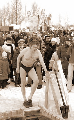 Если раньше в форсировании принимали участие одни лишь десантники, то сейчас известным маршрутом следовали тысячи людей. Значит, идею развили и довели до масленицы. Правда, если бы над головой летали самолеты, а возле пляжа приземлялись парашютисты (в прорубь), было бы еще эффектнее. Возможно, самолеты и парашюты приберегли на следующий год. Дед Скобарь вполне мог оказаться ветераном ВДВ. Деда вообще можно переименовать в Дембеля Скобаря.