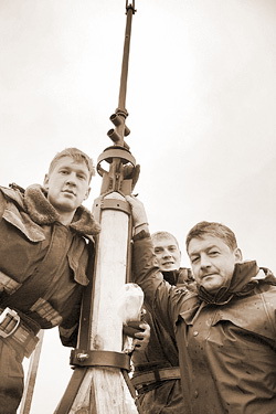 Сотрудники ООО «ПГС II» (справа налево) Егор Сёмочкин, Игорь Красиков и Владимир Смирнов на вершине шатра Покровской башни при установке осевого столба для крепления прапора. 18 ноября 2010 г. Фото: Николай Панарин