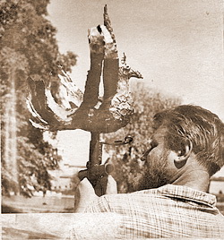 | Всеволод Петрович Смирнов с птицей прапора Власьевской башни. Фото М. И. Семенова, 1966 г. |