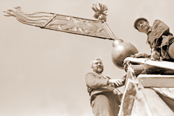| Установка прапора над Власьевской башней. Кузнецы Павел Шаповалов (справа), Андрей Степанов (слева), сотрудник МЧС Анатолий Селиванов (в центре). Фото: Лев Шлосберг |